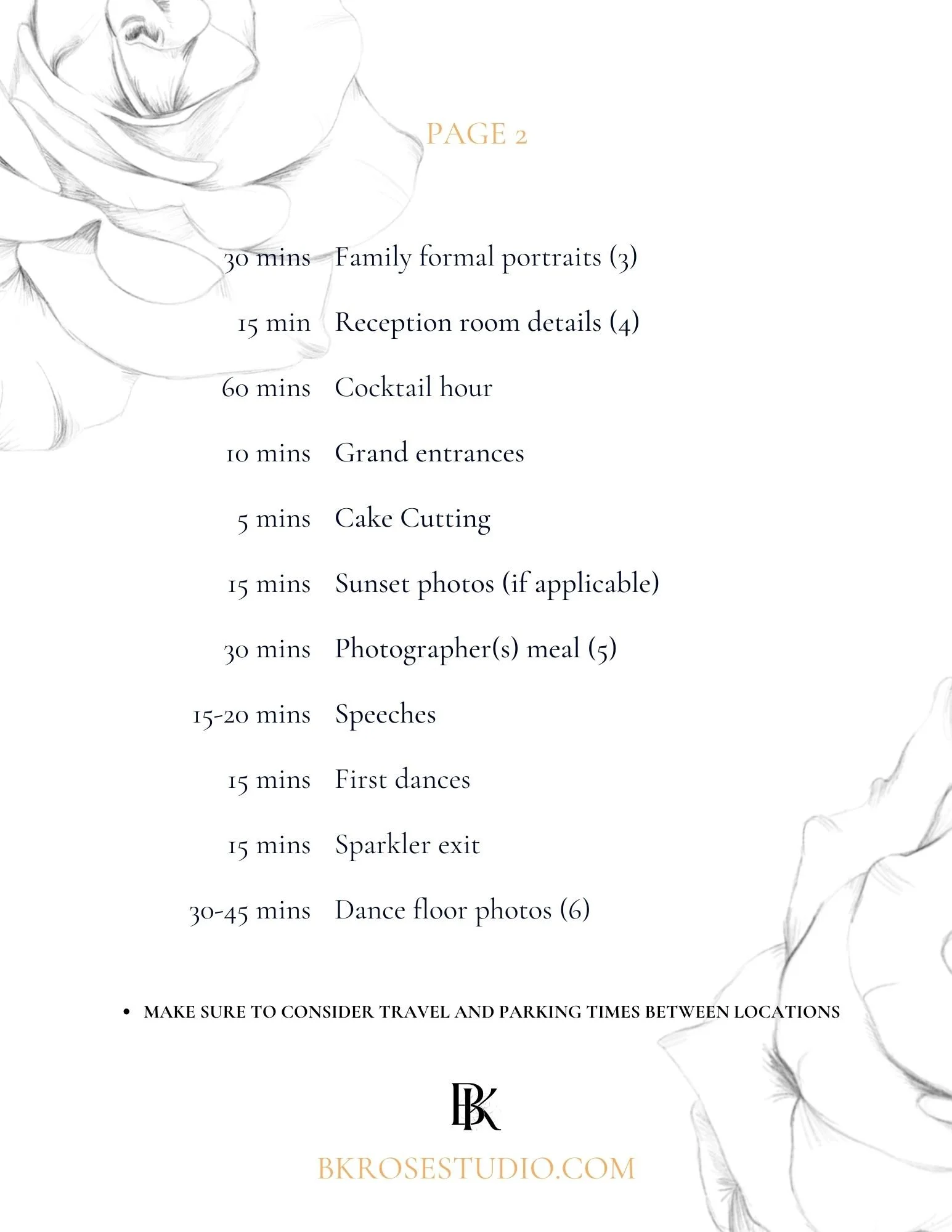 Below is our recommended timing for how long each portion of your wedding will take in regards to photos. This is a loose guideline and may change based on your particular situation. Please also consider travel times between locations.